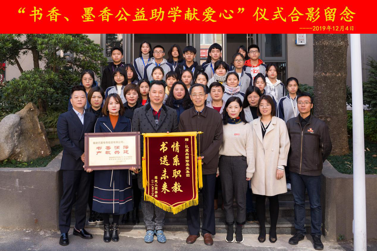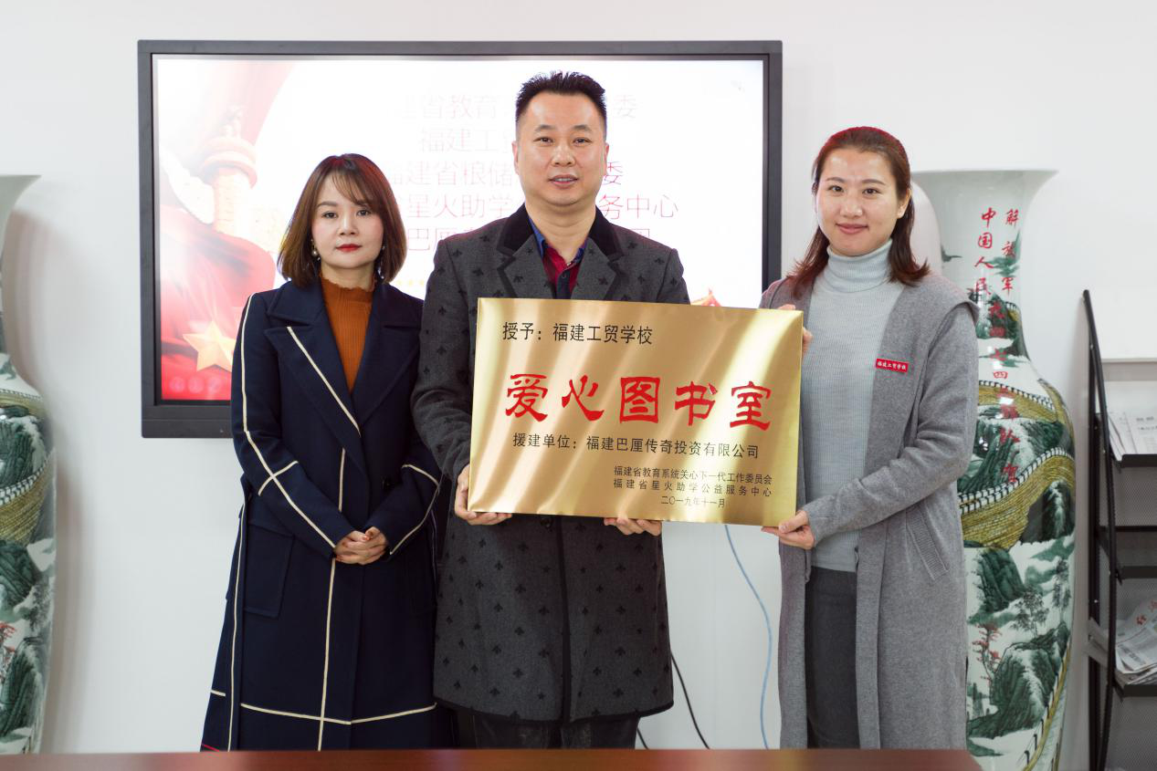 福建巴厘传奇投资有限公司李晶董事长、吴晓龙总经理为福建工贸学校授发“爱心图书室”牌匾(如图)