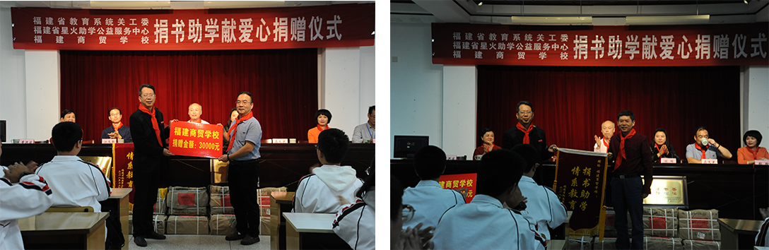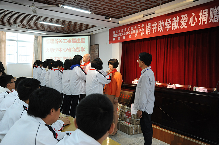 活动仪式上少先队员们向与会领导敬献红领巾,现场奏起嘹亮的国歌声。出席捐赠仪式的教育局江文新副局长致欢迎辞,表达了对福建省教育系统关工委、福建省星火助学公益服务中心、福建商贸学校“捐书助学”义举的赞赏和感激。松溪二中黄洪波书记致答谢辞,表达了诚挚的感谢和崇高的敬意,并代表学校接受福建商贸学校赠送的锦旗,同时勉励学生用实际行动回报大家的关怀,用优异成绩感谢社会的关爱。学生代表王奕丹用热情洋溢的语言表达了“爱读书,读好书,与书结伴”的心声。福建省教育系统关工委副秘书长吴选兴回顾自己读书的经历,激励二中学子勤学苦读,为实现中华民族伟大复兴的中国梦贡献青春和智慧。