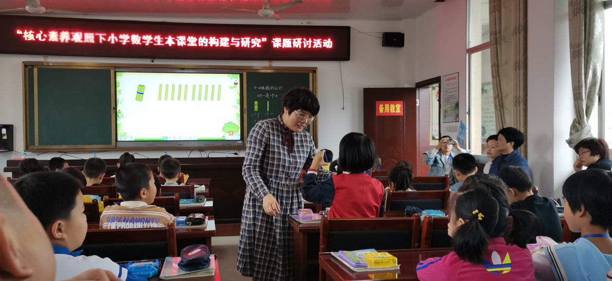 第三节,由闽清县白樟中心小学骨干教师黄乐梅执教人教版一年级上册《11-20各数的认识》一课。黄老师的教学亮点在于“三个注重”:一是注重在操作中体验。教师引导学生主动探索用小棒表示“十几”的方法,然后比较、择优,让学生感受到“一捆带几根”的数数优势,初步形成“一捆带几根”的数数模型;二是注重在经历中体验。教师引导学生经历认、读11~20 各数的过程,说说摆出的每一个数分别是由几个十和几个一组成,然后让学生看、读、比直尺上的数,积累数的大小的数学概念;三是注重实践中体验。教师引导学生在估计、比较以及用数描述简单生活现象的过程中不断丰富体验11-20各数的认识。黄老师的课堂朴实、灵动,让我们感到了新生力量的生命涌动。