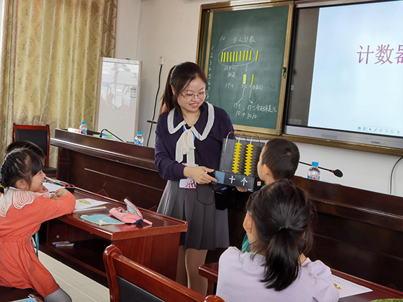 第二节,由工作室研修成员、建瓯市第二小学林瑶老师展示了北师大版一年级上册《古人计数》一课。林老师紧扣“以问题引领,促深度学习”的教学理念进阶式地不断把学生的数学学习活动推向纵深。课始,以“怎样表示出11根小棒”的数学问题为驱动,让学生观察、思考、演示、交流,认识到11根小棒可以看成1捆小棒另加1根, 初步建立“10个一就是1个“十”的数学概念;接着让学生在计数器上用珠子表示出11,变换角度认识、表达11,进一步强化“十”的计数单位;最后通过“19添上1根是多少根”这个问题,引导学生利用生活经验并借助直观认识到“因为 9 添上1是十,而2个十就是20,所以19根添上1根是20根”的数理关系。让与会老师深深地感受到:问题引领可以促进深度学习,让枯燥认数活动变得更加生动活泼。