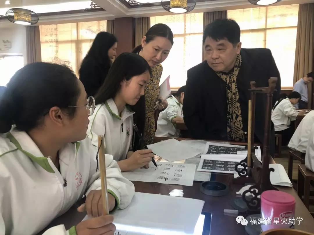 与练习书法的师生亲切交流